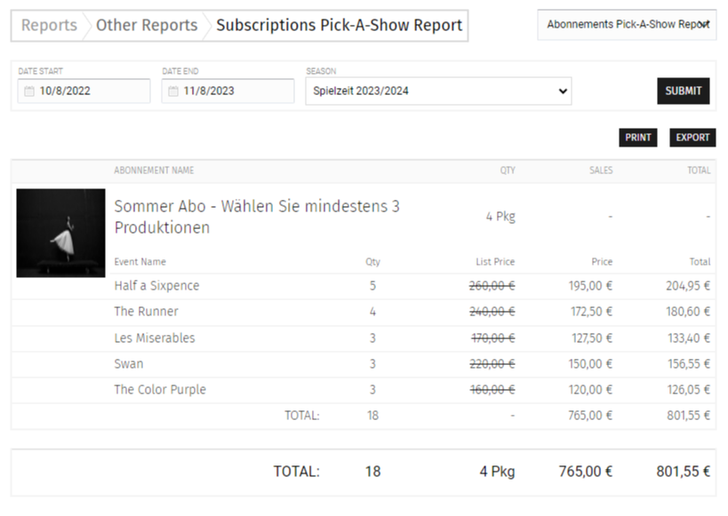 5. Im Bericht findest Du die Angaben zu verkauften Shows (innerhalb des Wahlabos), Anzahl, Listen- und Verkaufspreis im von Dir definierten Zeitraum.