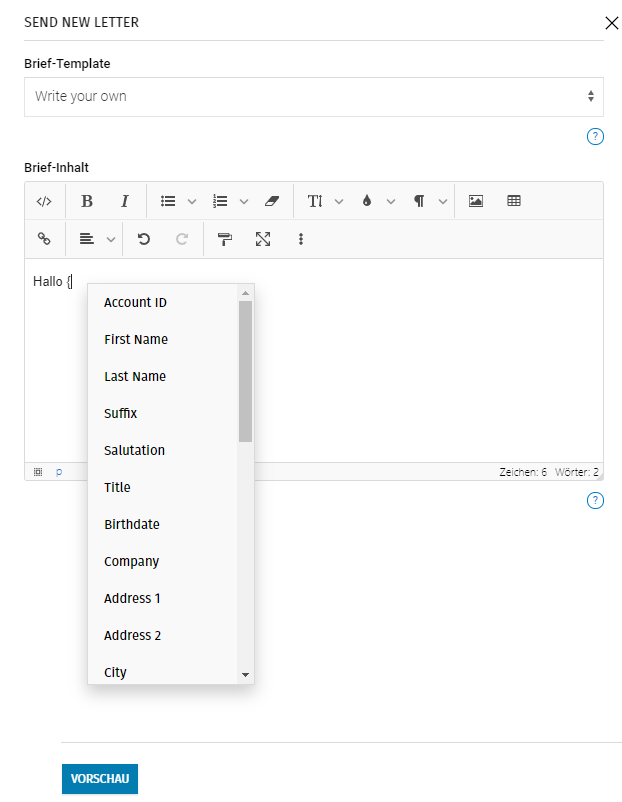 Variablen können mit dem Update im November schnell aus einer Liste ausgewählt werden. Damit die Liste der Variablen geöffnet wird, gib in das Textfeld die öffnende Klammer "{" ein. Die entsprechende Variable kann dann ausgewählt und eingefügt werden.
