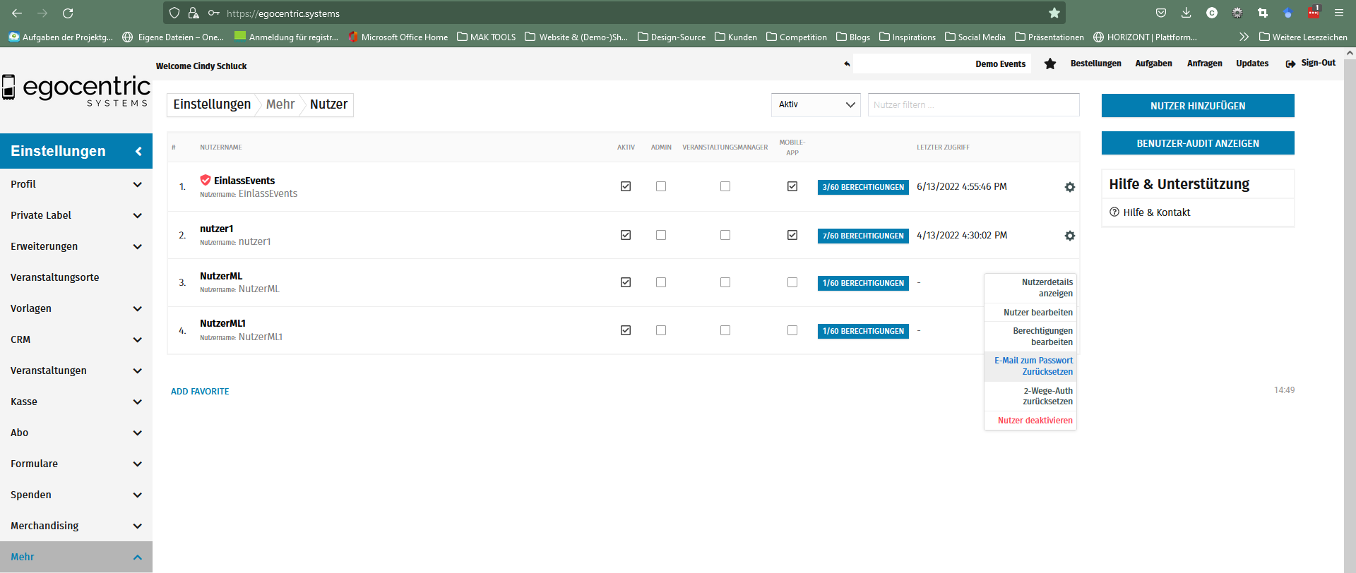 2. Über "Einstellungen" >> "Mehr" >> "Nutzer" gelangst Du zur Übersicht Deiner Nutzer. Wähle jetzt für den entsprechenden Nutzer über das Zahnrad ⚙️ die Option "E-Mail zum Passwort zurücksetzen" aus.