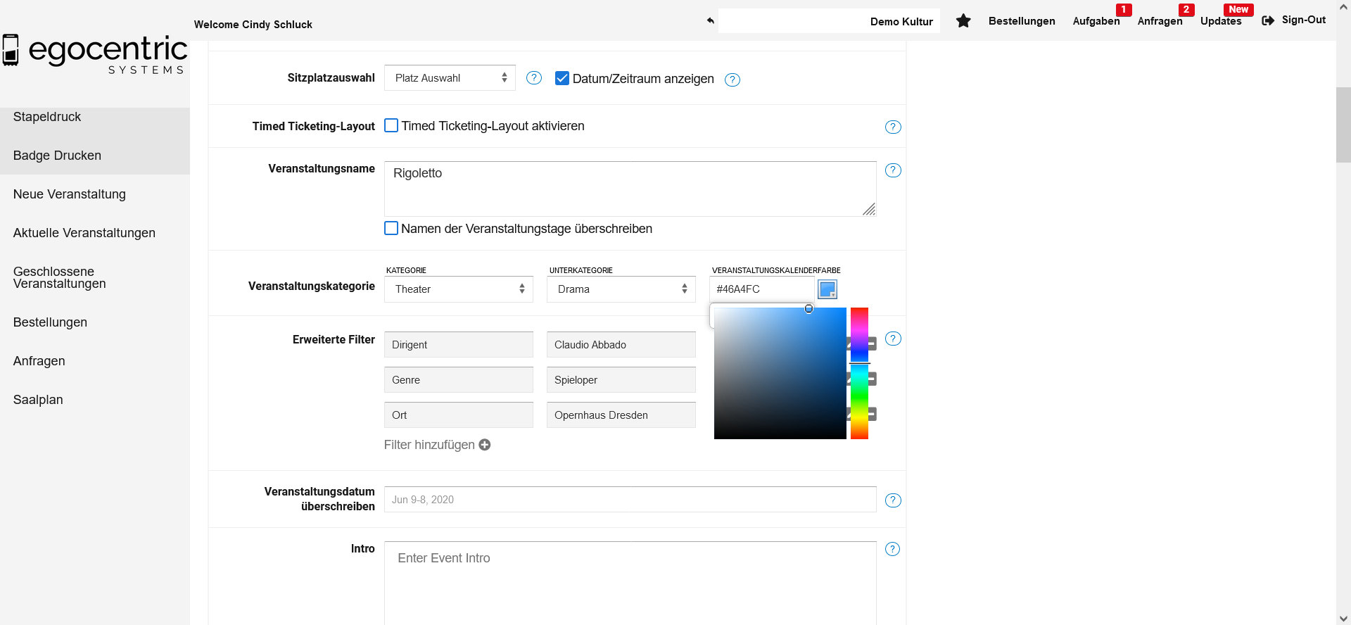 4. Nachdem Du gespeichert hast, wirst Du in der Kalenderansicht Deines Ticketshops die Farbe wiederfinden und außerdem in Deiner Veranstaltungsübersicht.