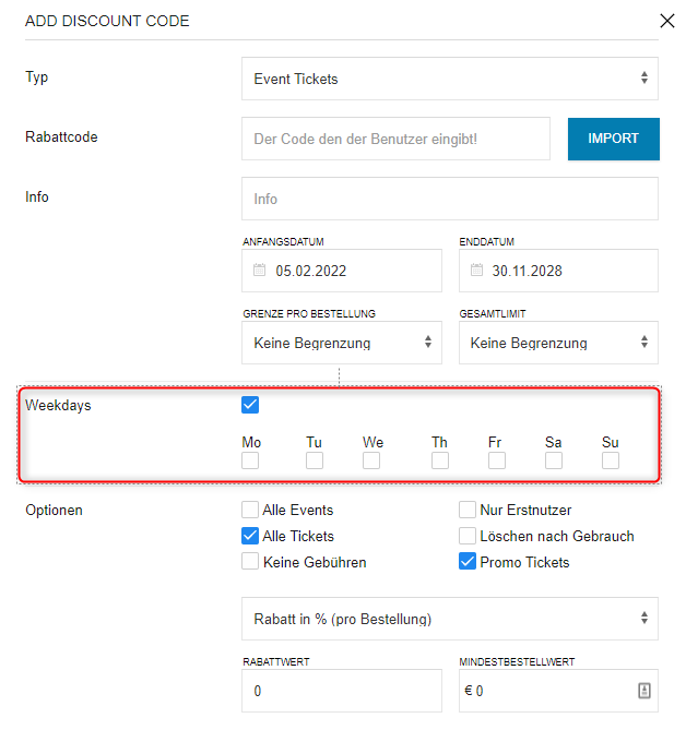 Für die Vergabe von Rabattcodes gibt es eine neue Auswahlmöglichkeit für die verschiedenen Wochentage. Damit kannst Du Rabatte in Abhängigkeit des Wochentags vergeben, ohne diese über die Ticket spezifische Zuordnung den einzelnen Tagen zuordnen zu müssen.